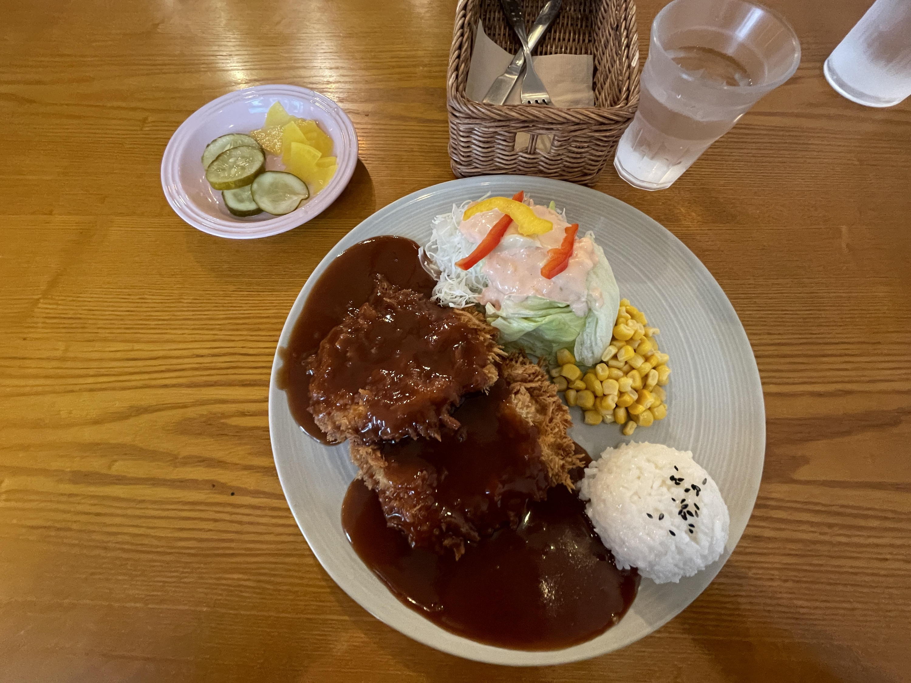 조금 있다 본 메뉴가 나왔다. 큰 접시에 샐러드, 스위트콘, 밥, 돈까스가 올라와 있고 소스가 뿌려져 있다.