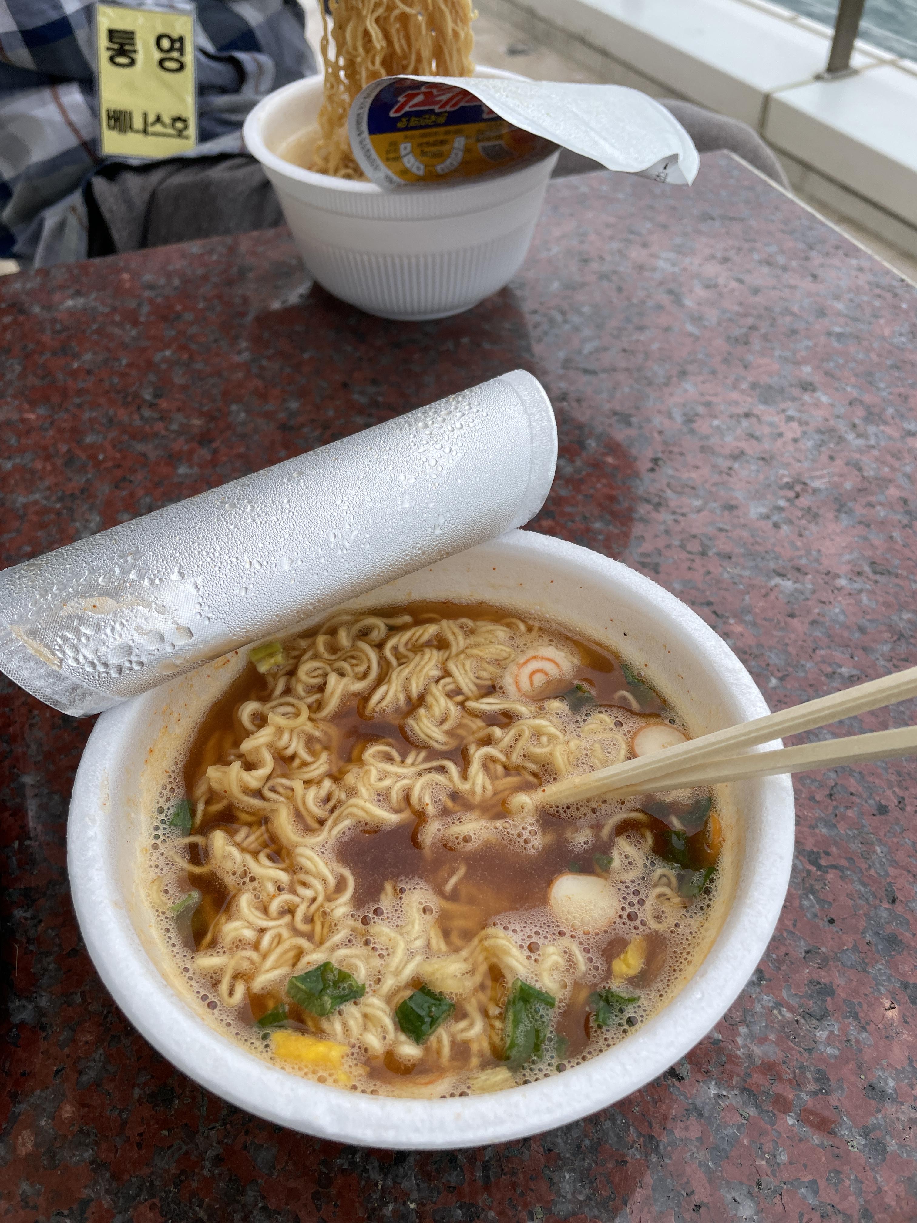 아무튼 육개장 컵라면을 들고 테라스석에서 먹었다(가격은 무려 3000원, 종업원이 물은 부어준다.)