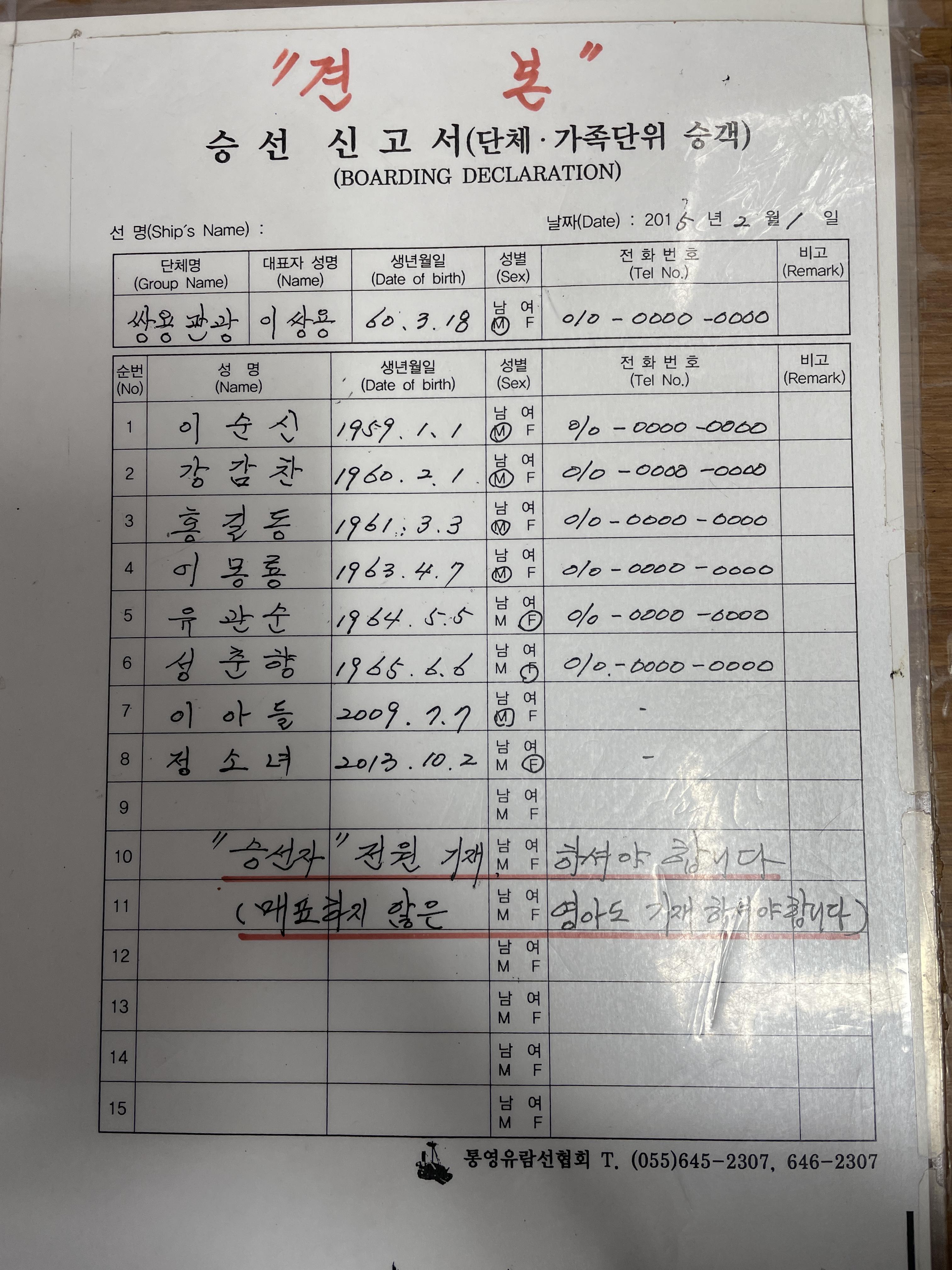 배에 탈 때는 이렇게 승선 신고서를 의무로 작성하여야 한다. 그리고 확인을 위한 신분증도 가지고 있어야 한다.