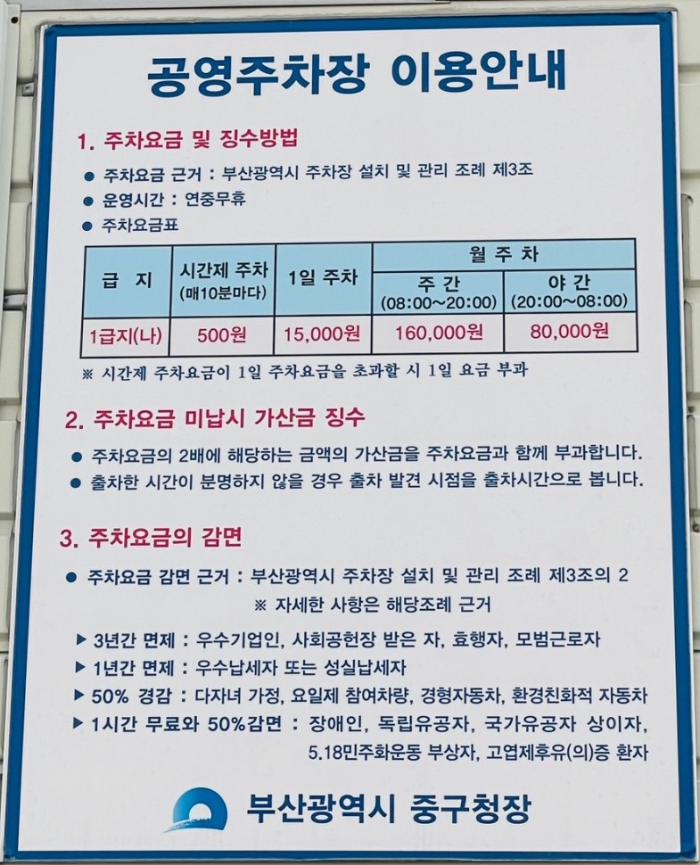 주차는 국제시장 근처에 유료 주차장이 여러 곳 있었는데 그중에서 나는 용두산 공영주차장에 주차하였다.
