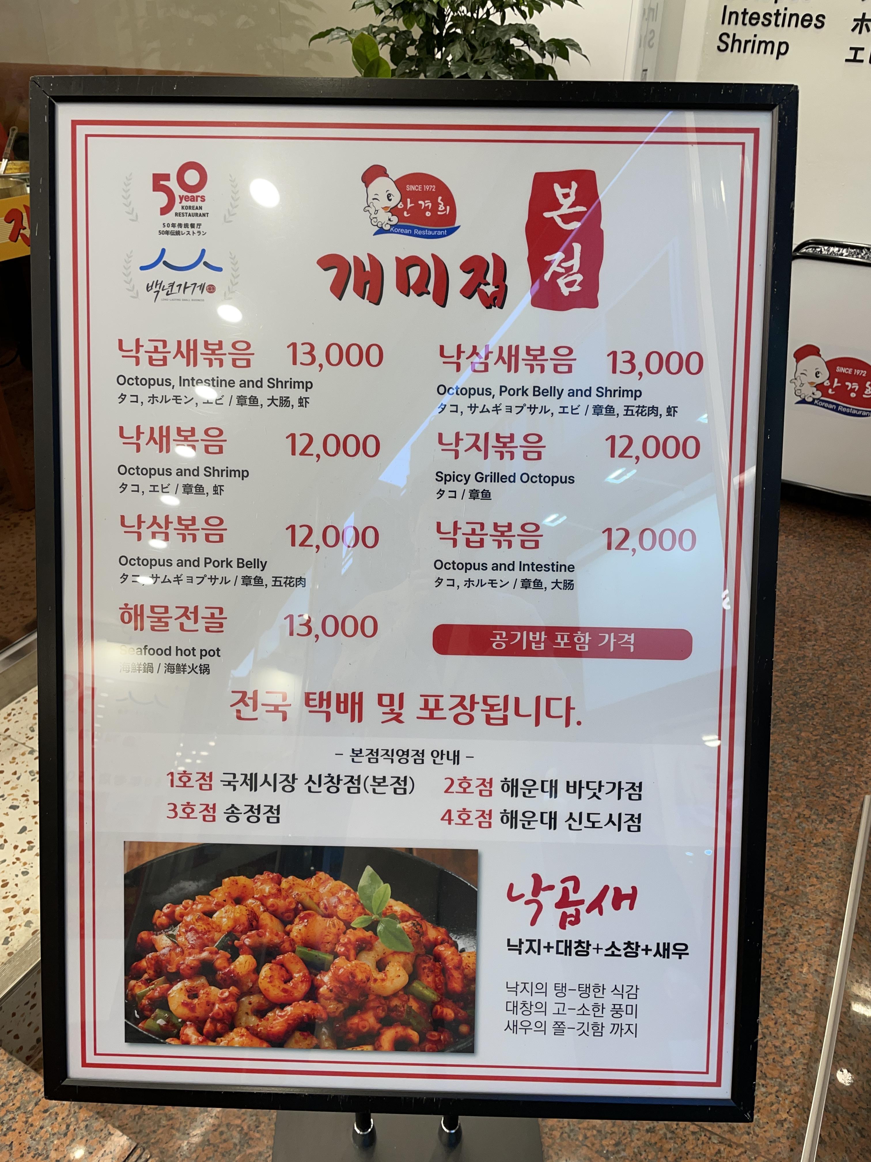 2024년 1월 28일 기준 식당 앞에 있는 메뉴판. 난 낙곱새의 곱이 당연히 곱창이라고 생각했는데 알고 보니 대창이었다...