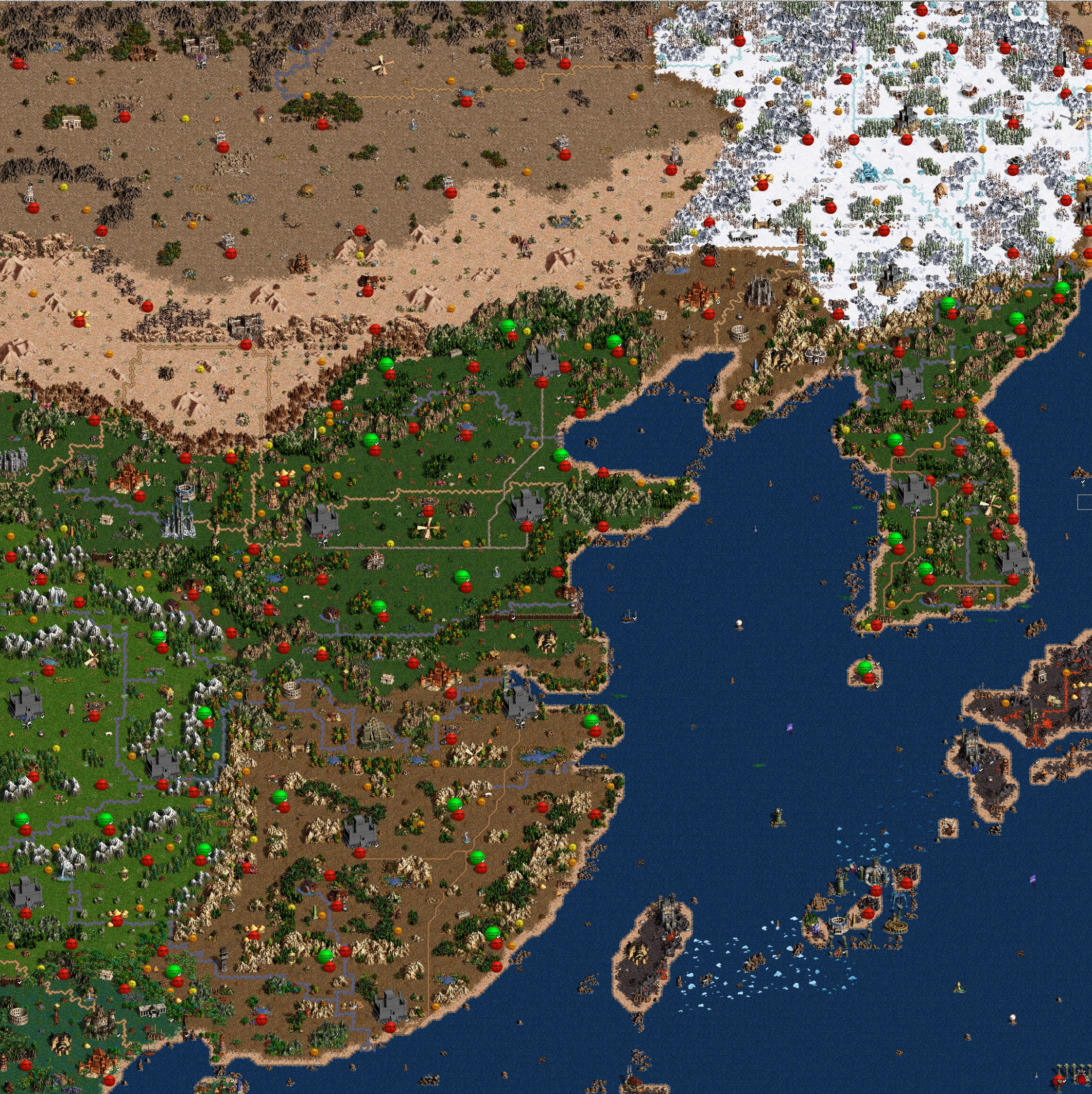 4.각 진영에서 다른 진영으로 넘어갈 때는 중립 지대(이하 요충지)를 거쳐 가야 하는데 이 요충지에는 금광과 폐광, 드래곤의 성역 등의 자원과 아티펙트들, 그리고 시의회+성+자원창고가 미리 지어진 도시가 존재한다. 다만 요충지로 넘어오려면 요새를 뚫어야 하는데 소수의 4대 드래곤들이 지키고 있는 지역이라 초반에는 진출하기 쉽지 않다.