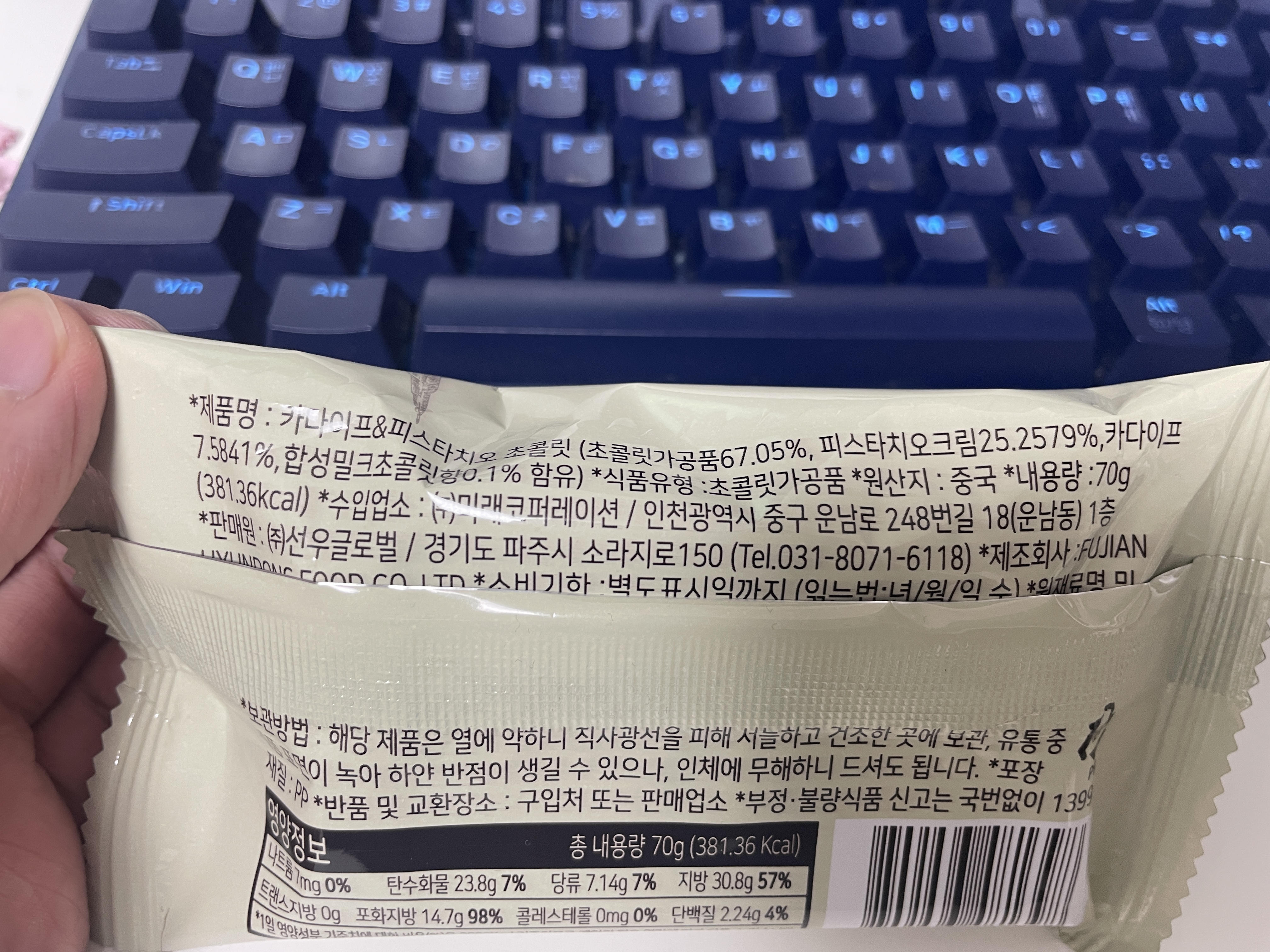 앞면과 뒷면. 이 녀석은 피스타치오크림(스프레드) 25.2%에 카다이프면 7.58%가 들어있다.