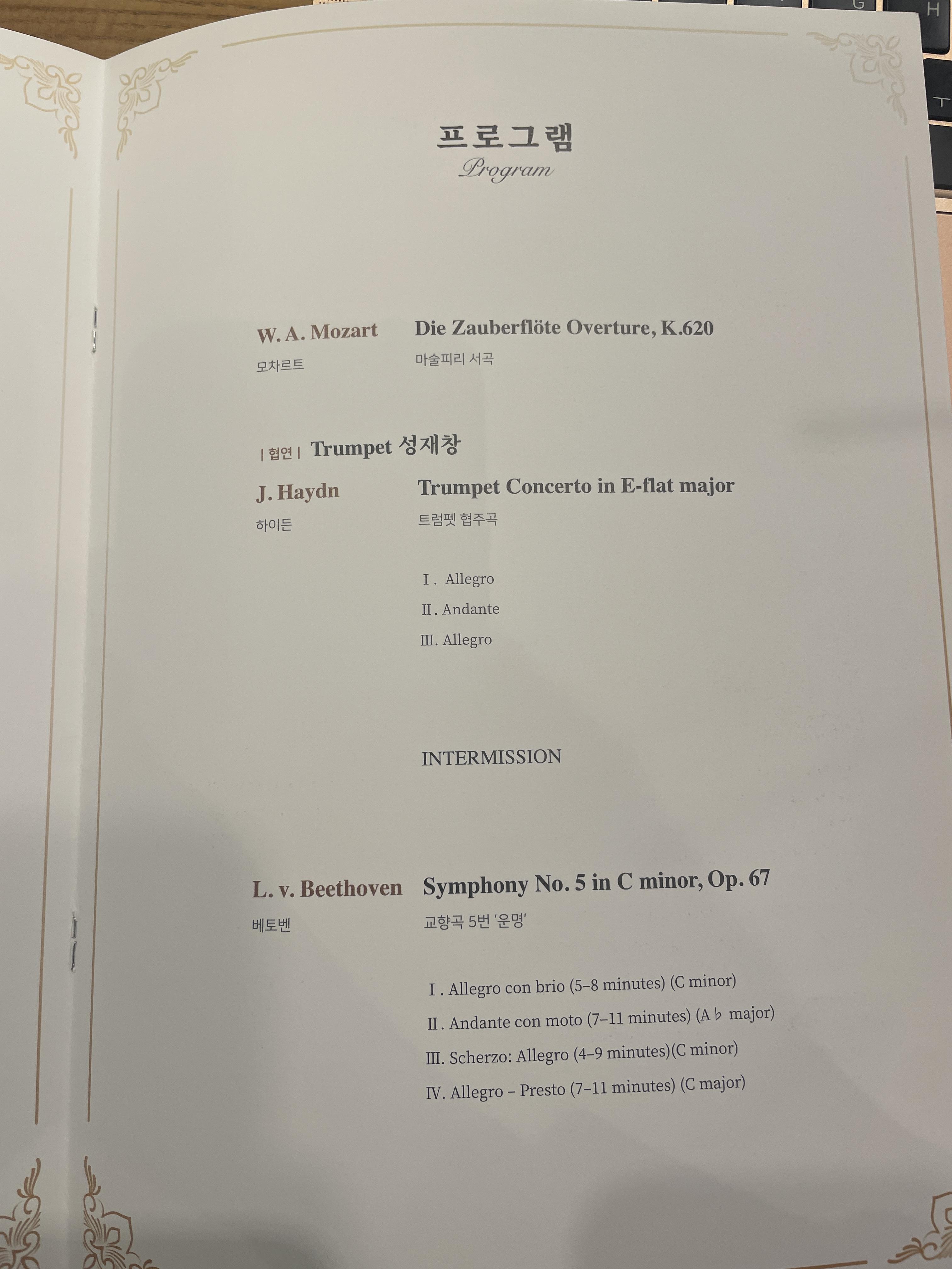 하이든 트럼펫 협주곡의 협연자 성재창 교수의 연주는 굉장히 훌륭했다. 트럼펫이라는 악기가 이렇게 간드러진 음향도 선보일 수가 있었구나 싶었다. 스피커로는 절대 느끼지 못할 잔향과 미세한 음의 진동에 큰 감명을 받았다.