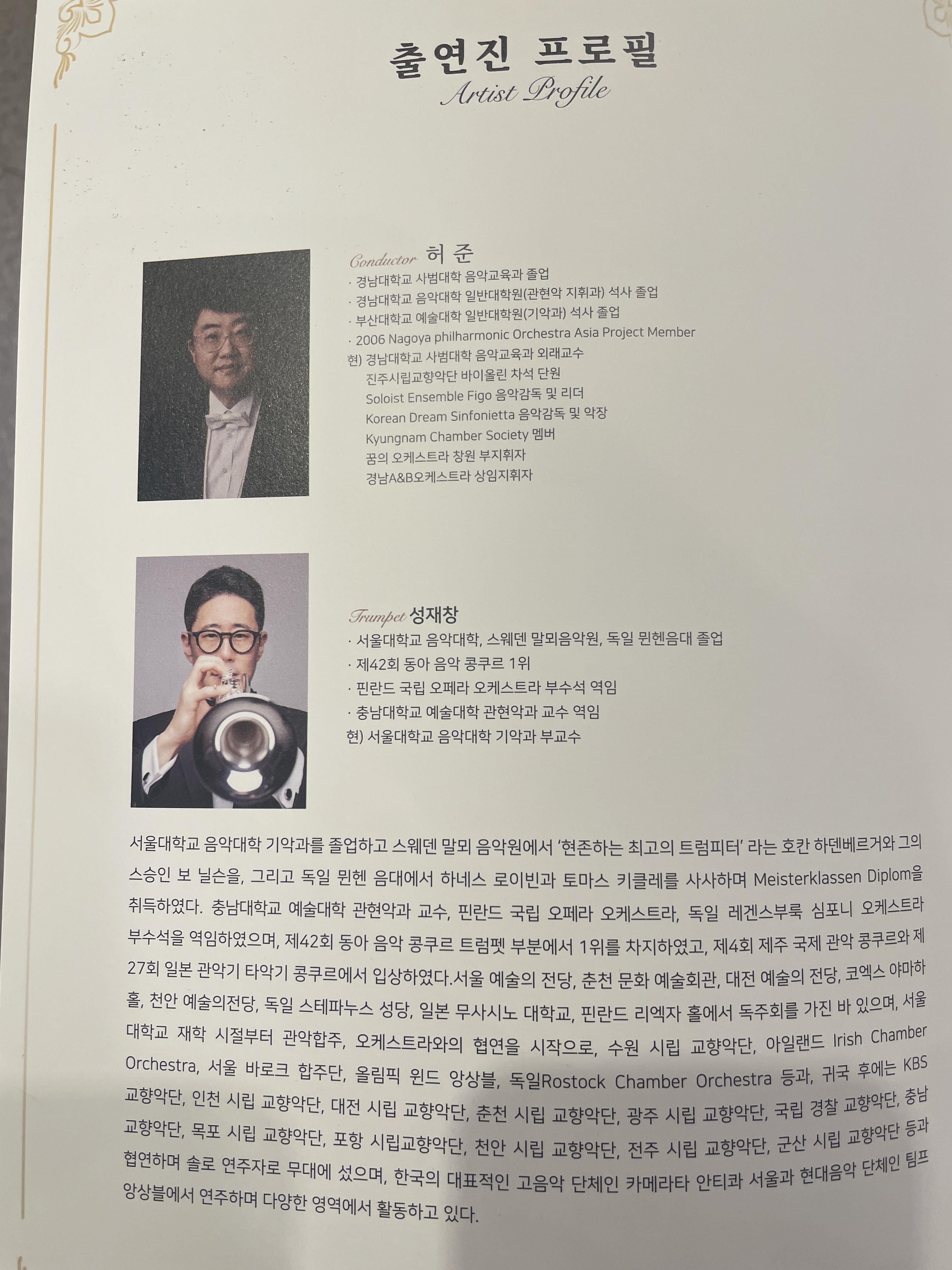 지휘자는 오케스트라 상임지휘자인 허준이고 협연자는 서울대 음대 기악과 교수로 재직중인 트럼페터 성재창 교수이다.