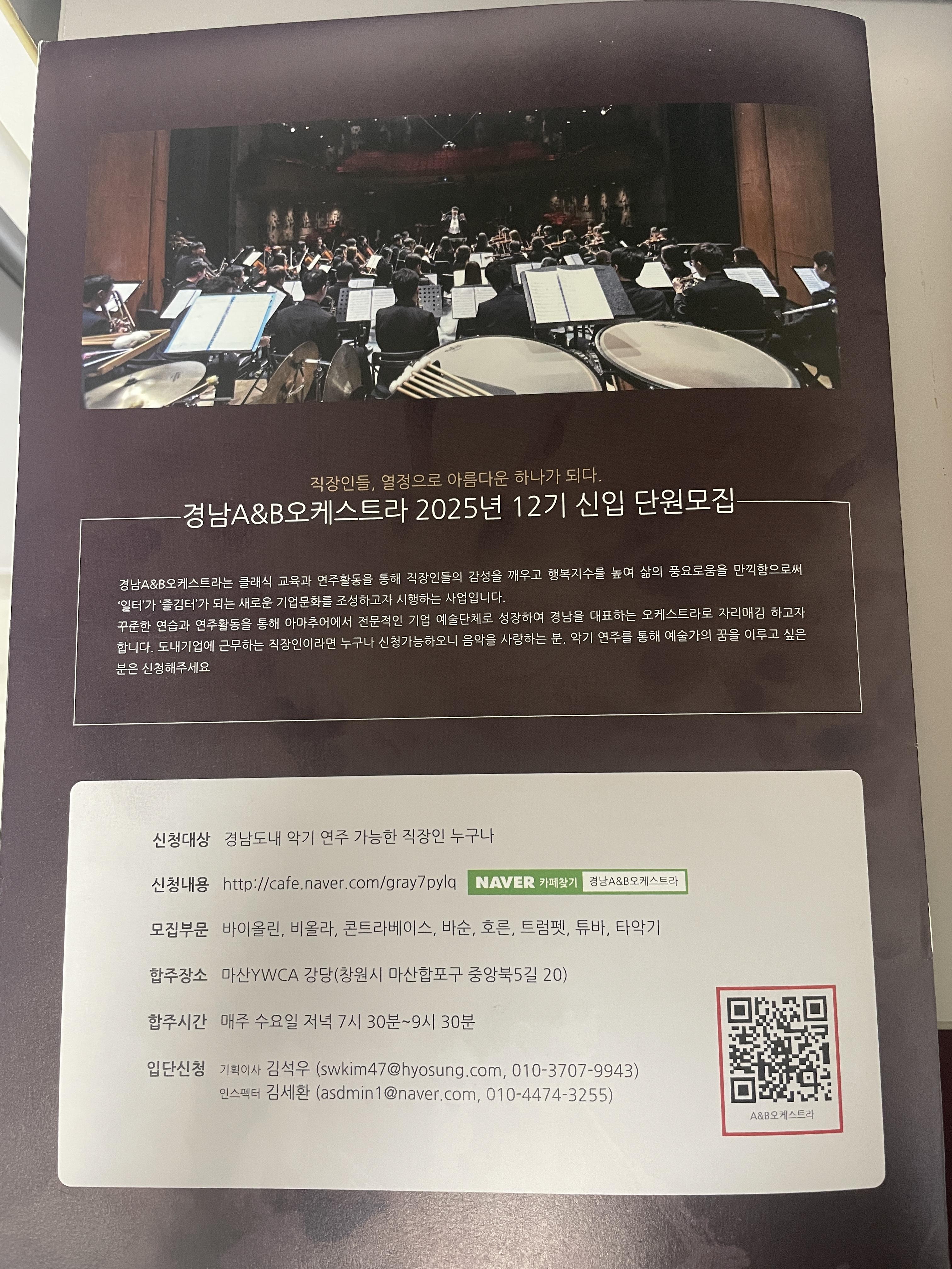 2024년 12월 18일 수요일 오후 7시 30분, 김해 장유에 위치한 김해서부문화센터 하늬홀에서 경남 직장인들의 아마추어 오케스트라인 경남A&B오케스트라의 제11회 정기연주회가 있었다.