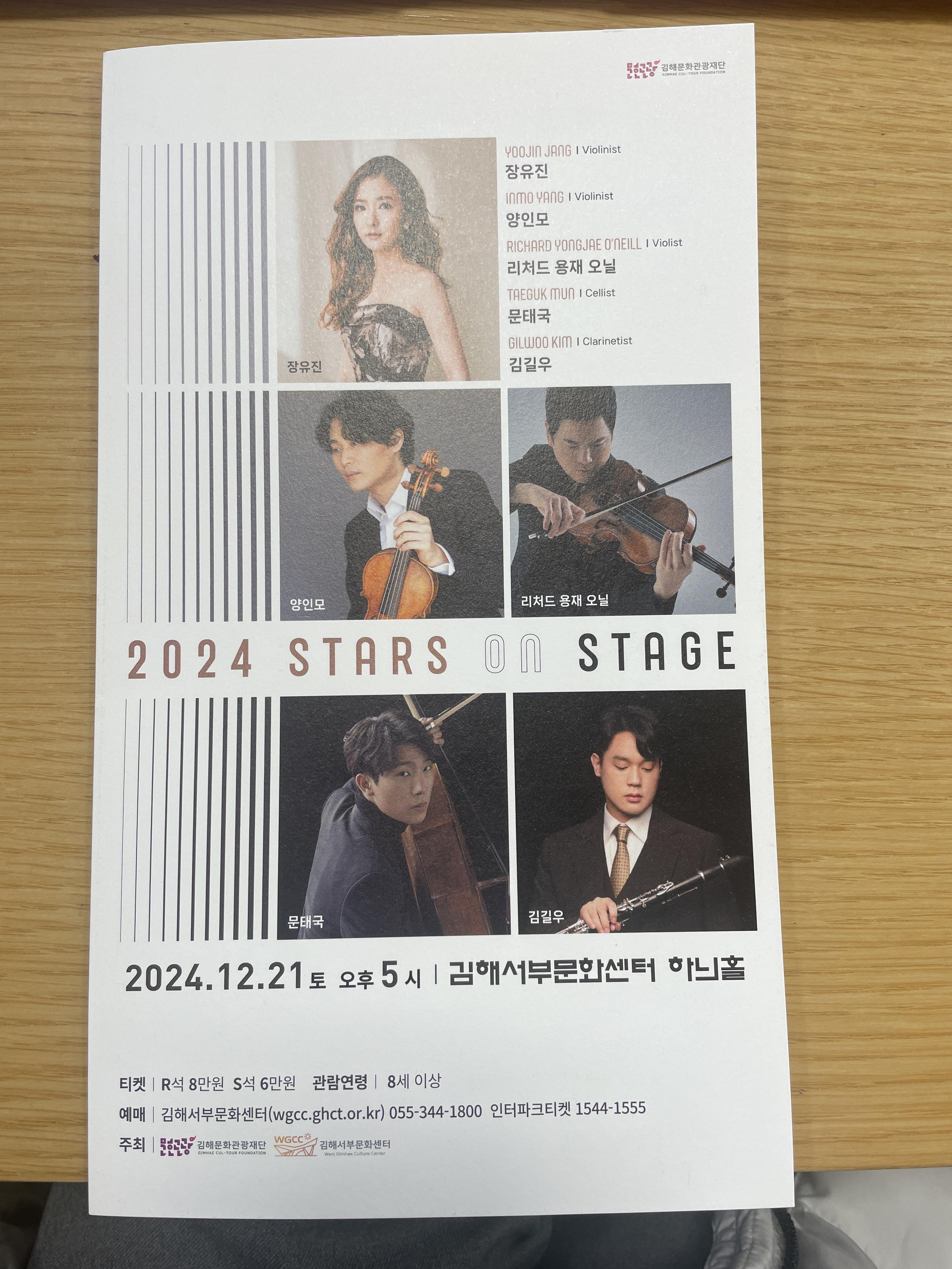 2024년 12월 21일 토요일 오후 5시에 한국의 잘나가는 젊은 연주자 5인이 모여 연주하는 실내악 연주회 <2024 Stars on Stage> 김해 공연을 감상하러 갔다.