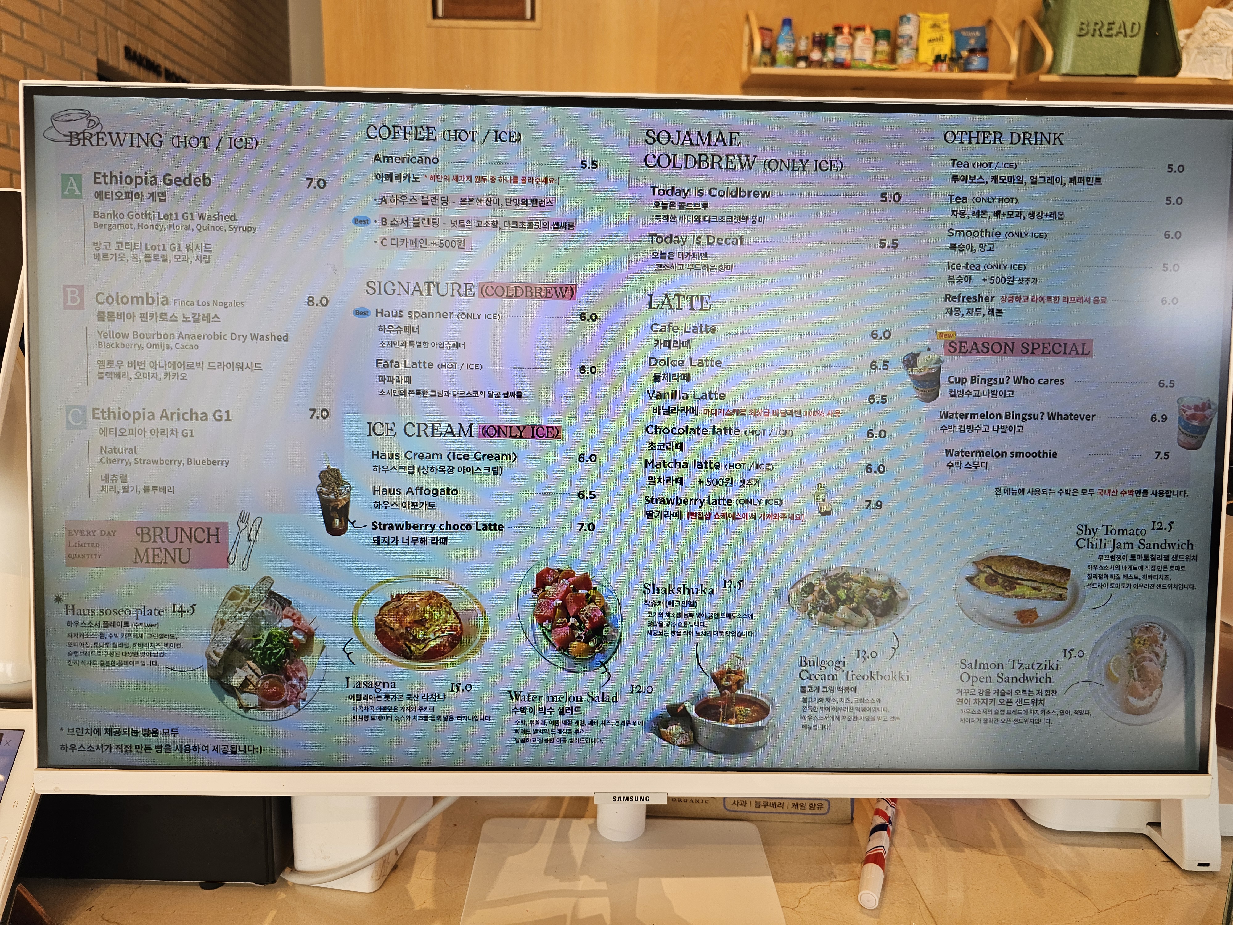 카페 메뉴판. 음료 종류는 그렇게 다양하지는 않다. 대신 브런치 매뉴들이 눈에 띄는데 심지어 떡볶이도 판다.